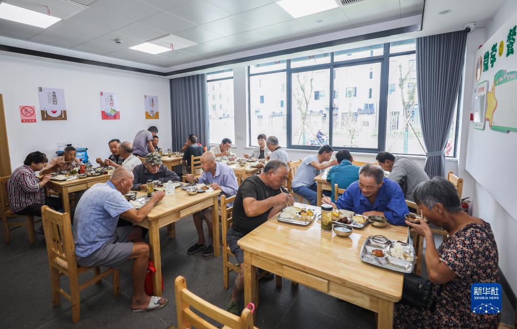 8月23日,在湖州市吳興區東林鎮東華村居家養老服務(wù)中心,老人們在老年食堂就餐。