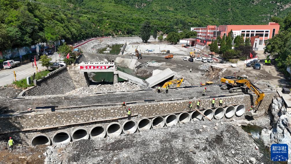 8月23日,在北京市房山區霞云嶺中心小學(xué),北京建工機施集團的施工人員在搶建供學(xué)校與外界通行的新橋梁(無(wú)人機照片)。