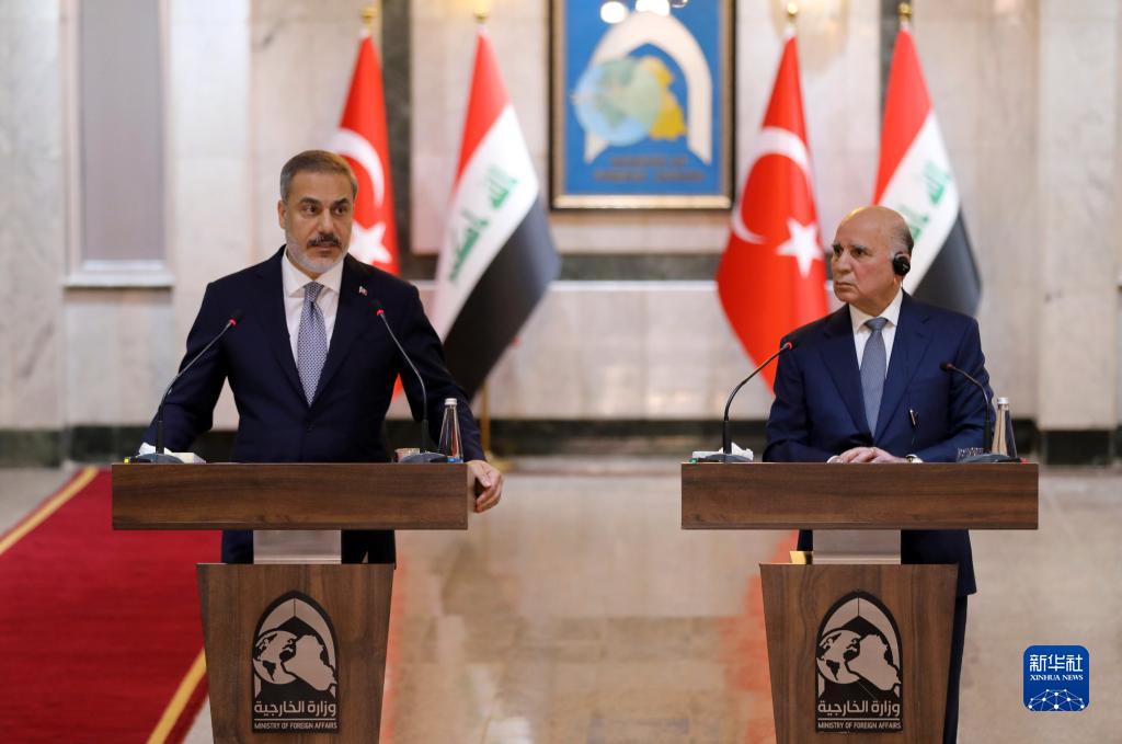 8月22日,伊拉克外長(cháng)侯賽因(右)與到訪(fǎng)的土耳其外長(cháng)菲丹在巴格達舉行聯(lián)合記者會(huì )。