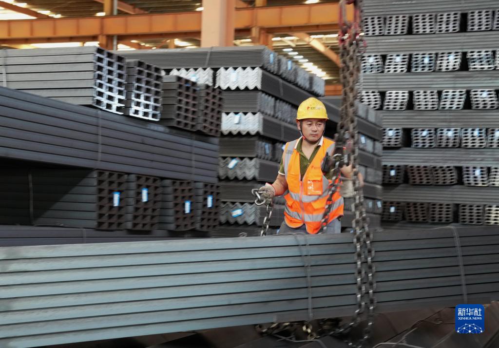 8月23日,唐山市豐潤區一家鋼鐵企業(yè)的工人在成品庫給準備裝車(chē)外運的鋼材安裝吊運掛鉤鏈。