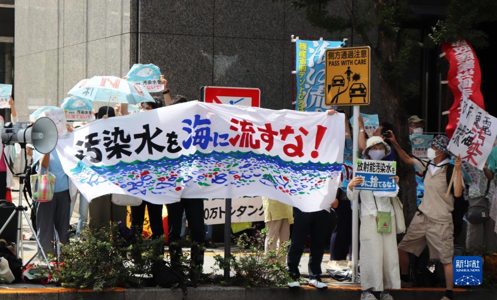 8月24日,日本民眾手持“不許將污染水排入大?!钡葮苏Z(yǔ)在東京電力公司總部前集會(huì ),抗議日本政府和東電公司無(wú)視民意啟動(dòng)核污染水排海。