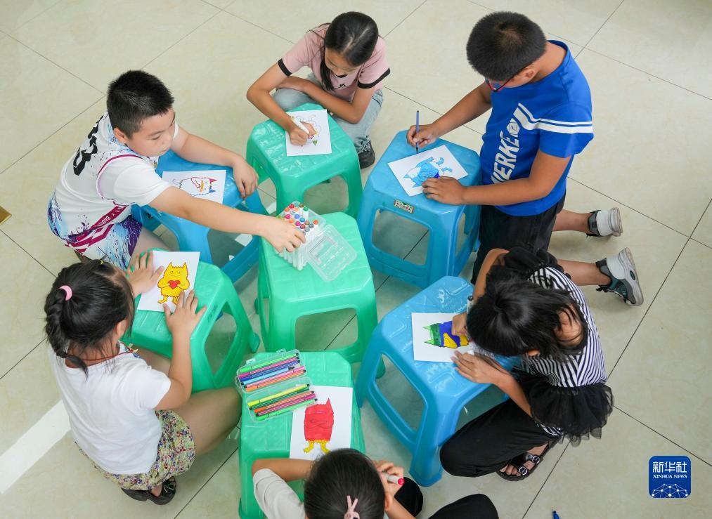 8月24日,在重慶市九龍坡區新民村村委會(huì )活動(dòng)室內,孩子們在心理咨詢(xún)師志愿者的指導下為“情緒小怪獸”上色。新華社記者 劉潺 攝