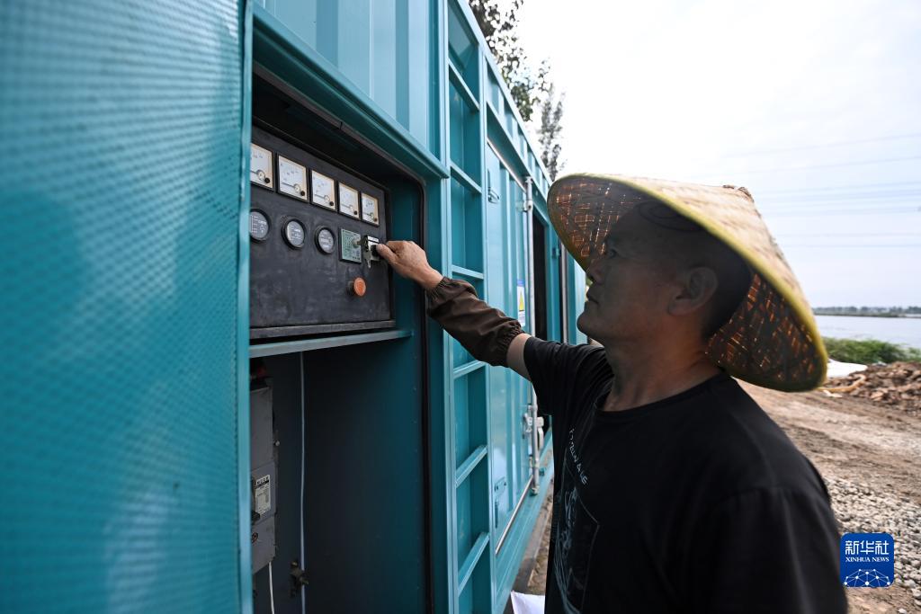 8月24日,工作人員在天津市靜海區大清河南堤抽水現場(chǎng)調節大型抽水泵功率。
