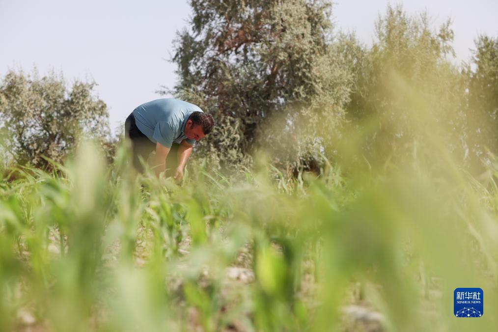 8月17日,爾肯·熱衣木查看第二茬青貯玉米生長(cháng)情況,第一茬青貯玉米7月份已經(jīng)收割。