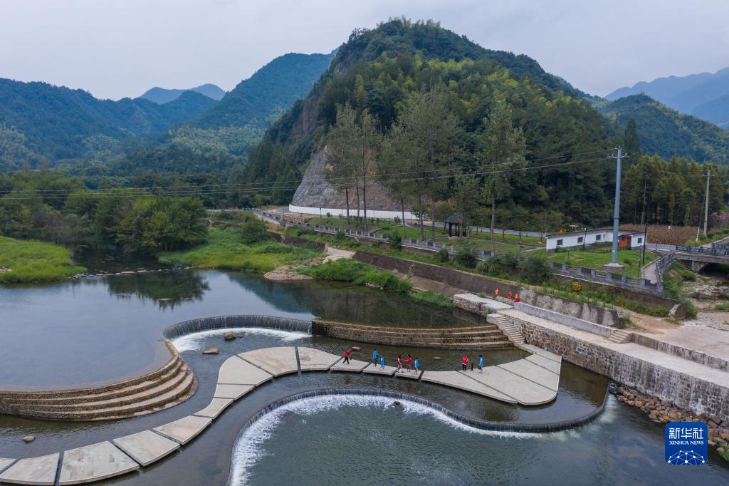 8月25日,青年黨員志愿者在湖源鄉壺源溪清理垃圾(無(wú)人機照片)。