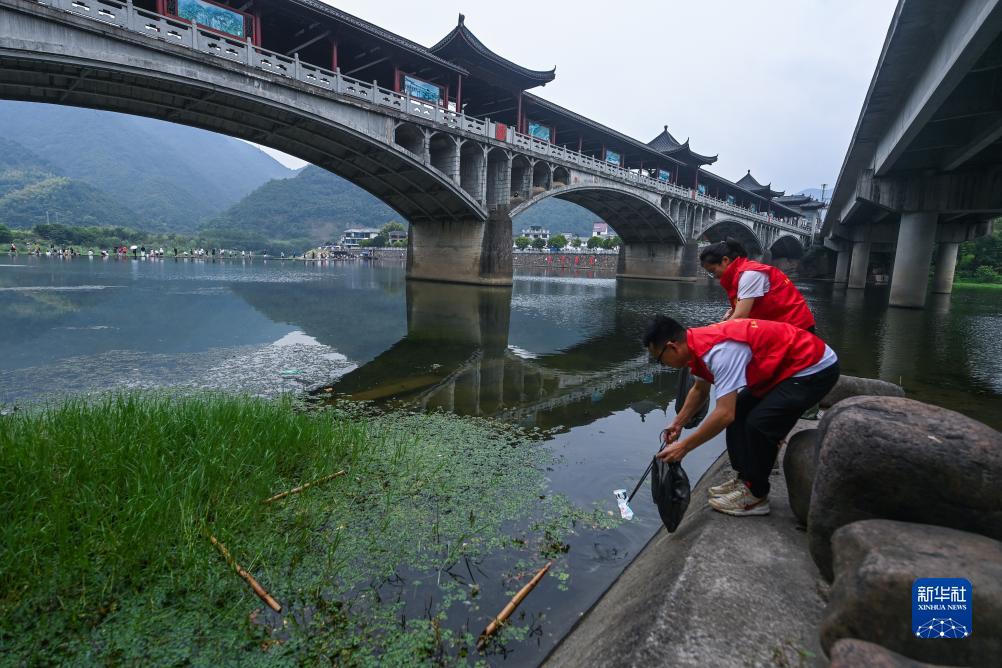 8月25日,青年黨員志愿者在湖源鄉壺源溪龍麟壩段清理垃圾。