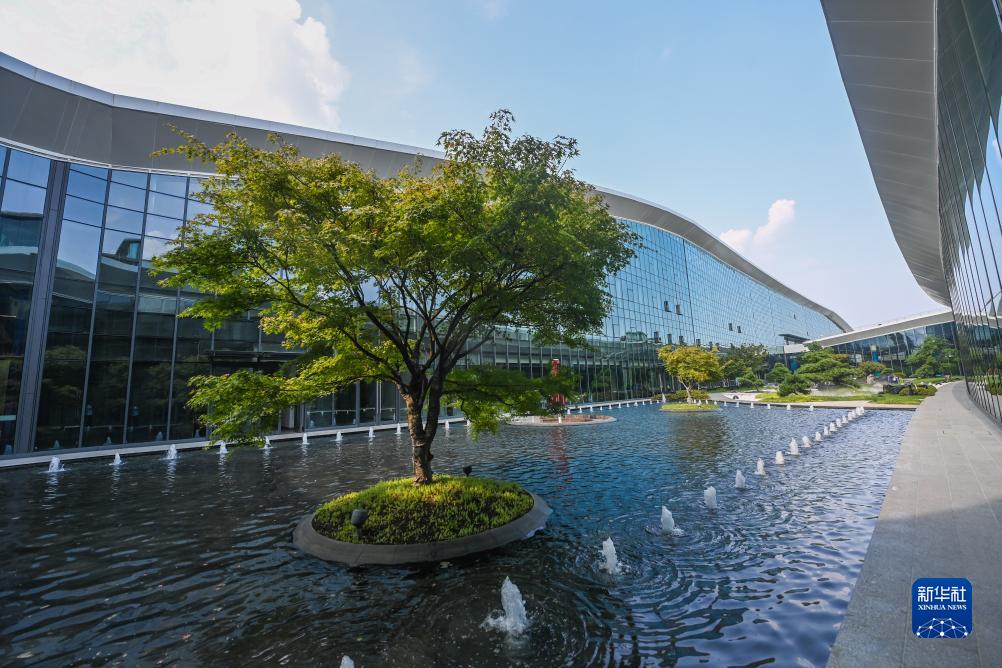 這是8月24日拍攝的杭州富陽(yáng)水上運動(dòng)中心的中庭花園,水池中的水來(lái)自于循環(huán)利用的雨水。新華社記者 徐昱 攝