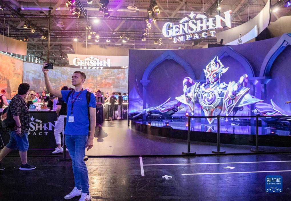 8月23日,在德國科隆游戲展上,一名參觀(guān)者在米哈游展臺前自拍。