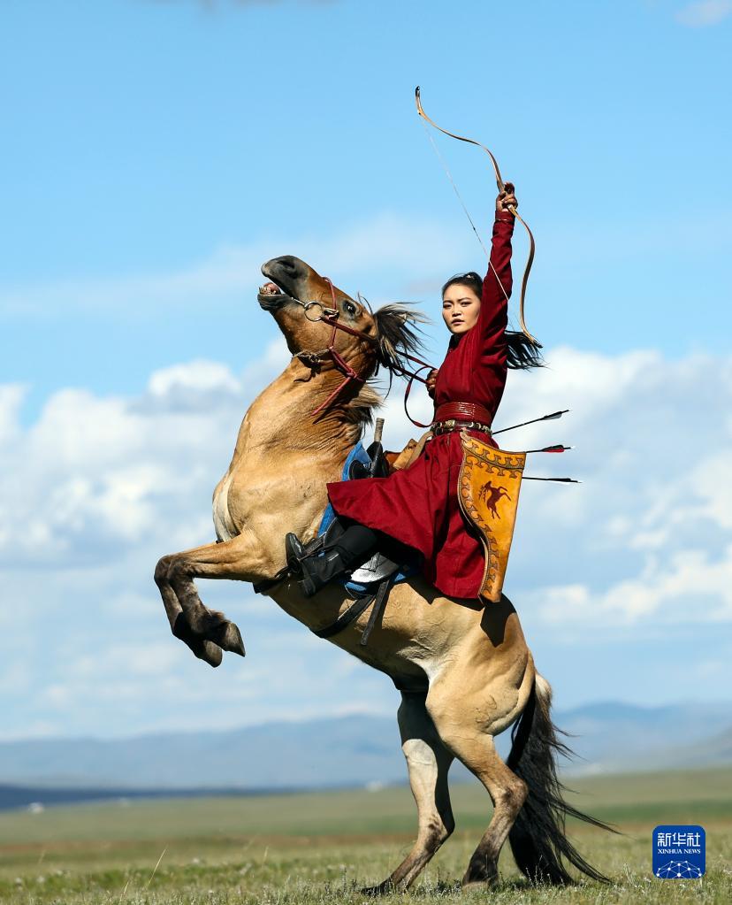 8月19日,在蒙古國泰吉山谷,一名女選手在蒙古國“游牧民族”世界文化節上展示騎馬射箭。