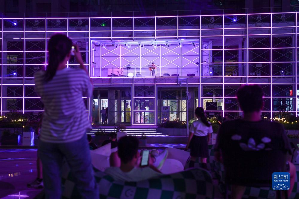 市民游客在南京市建鄴區西城·夜未央街區內觀(guān)看空中舞臺表演(8月25日攝)。