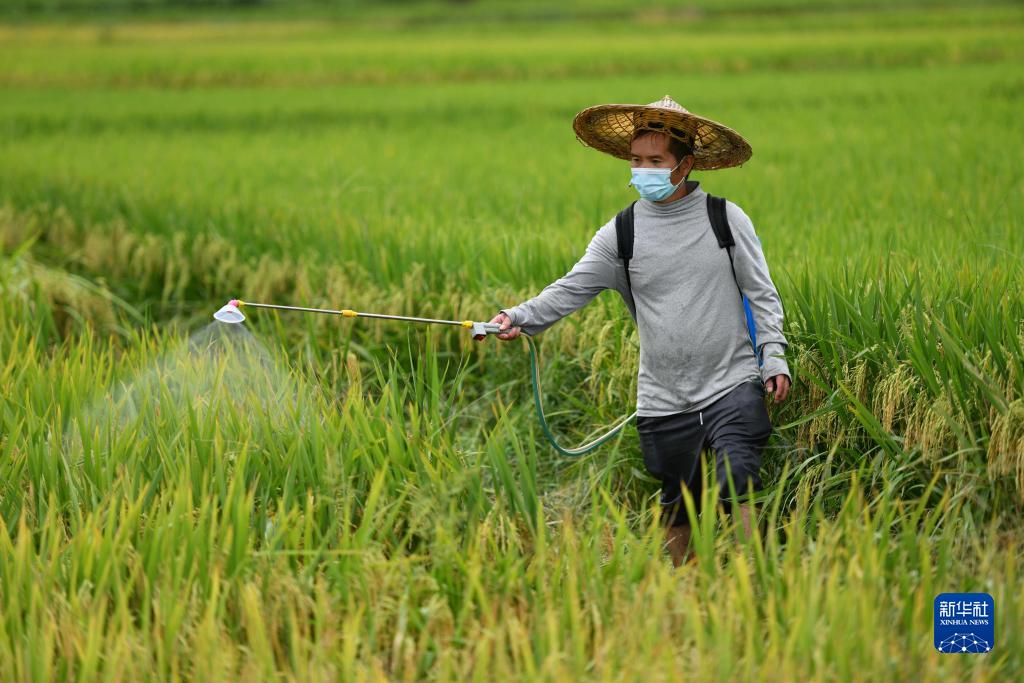 8月26日,村民在貴州省黔東南苗族侗族自治州黃平縣舊州鎮寨碧村進(jìn)行水稻防蟲(chóng)作業(yè)。