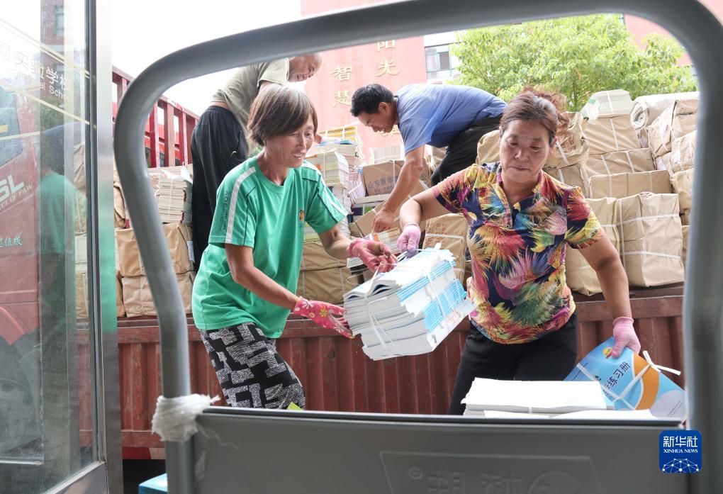 8月26日,在山東省臨沂市臨沂沂河實(shí)驗學(xué)校,學(xué)校教職工在搬運新學(xué)期教材。