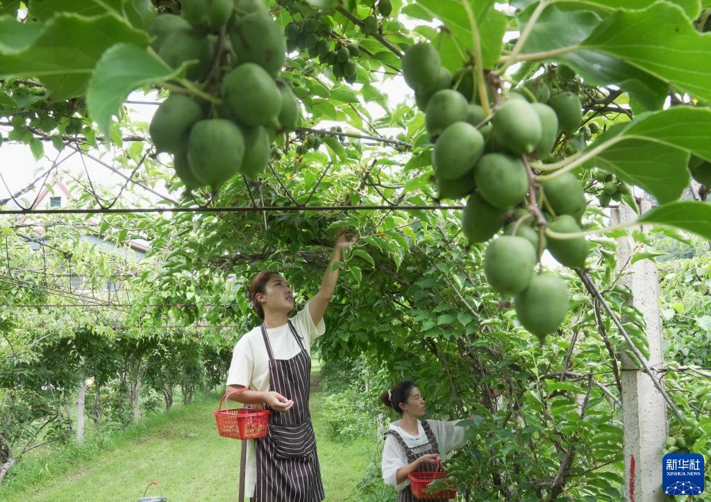 8月26日,秦皇島市海港區駐操營(yíng)鎮花廠(chǎng)峪村軟棗獼猴桃種植基地的工人在采摘軟棗獼猴桃。