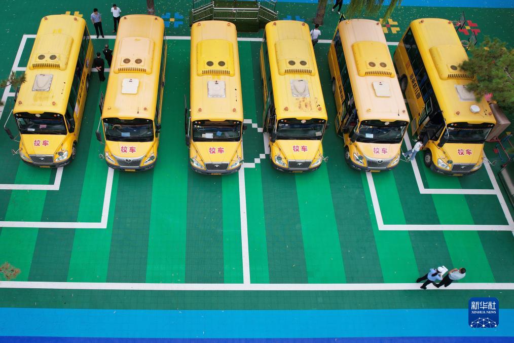 8月27日,石家莊市公安局藁城分局交通警察大隊民輔警在海英幼兒園對校車(chē)進(jìn)行安全檢查(無(wú)人機照片)。