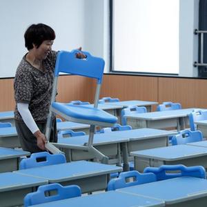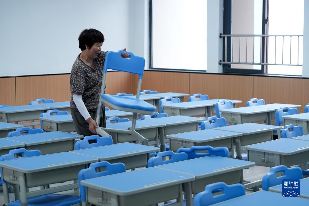 8月27日,在重慶市北碚區兩江春暉小學(xué),工作人員在整理教室桌椅。