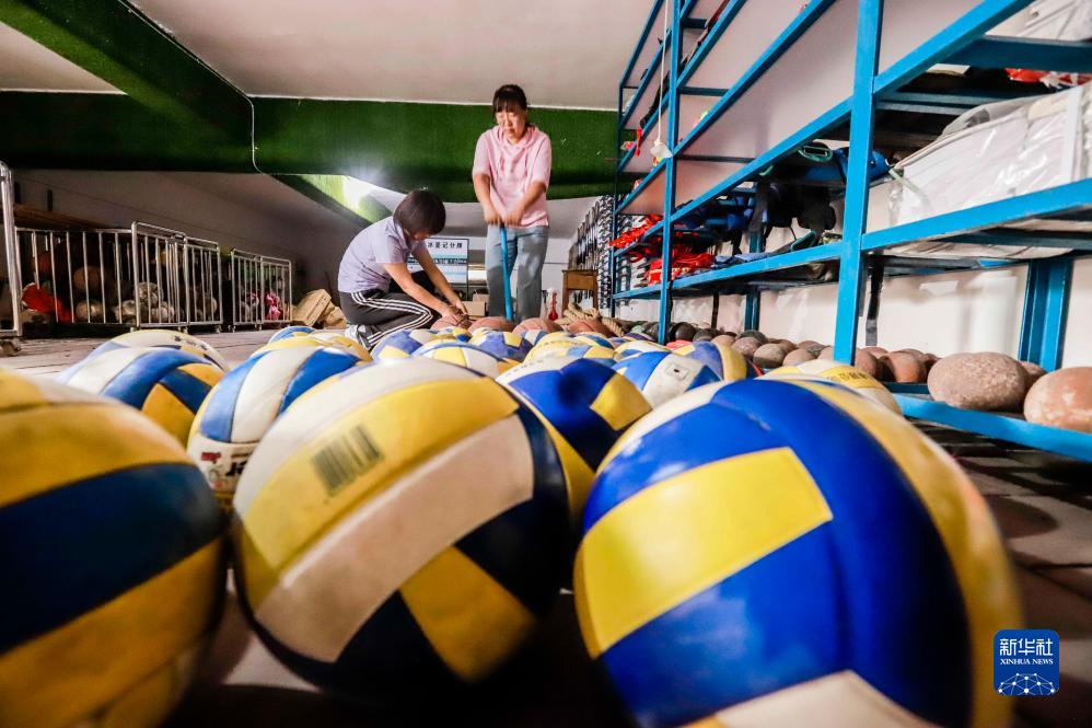 8月27日,河北省遵化市第三中學(xué)的教師在給排球充氣。