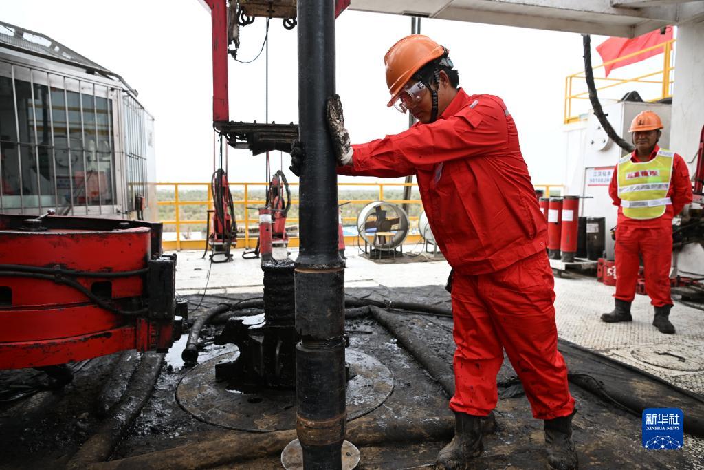 工作人員在中國石化塔里木盆地“深地工程”躍進(jìn)3-3XC油氣井進(jìn)行鉆井輔助作業(yè)(8月21日攝)。