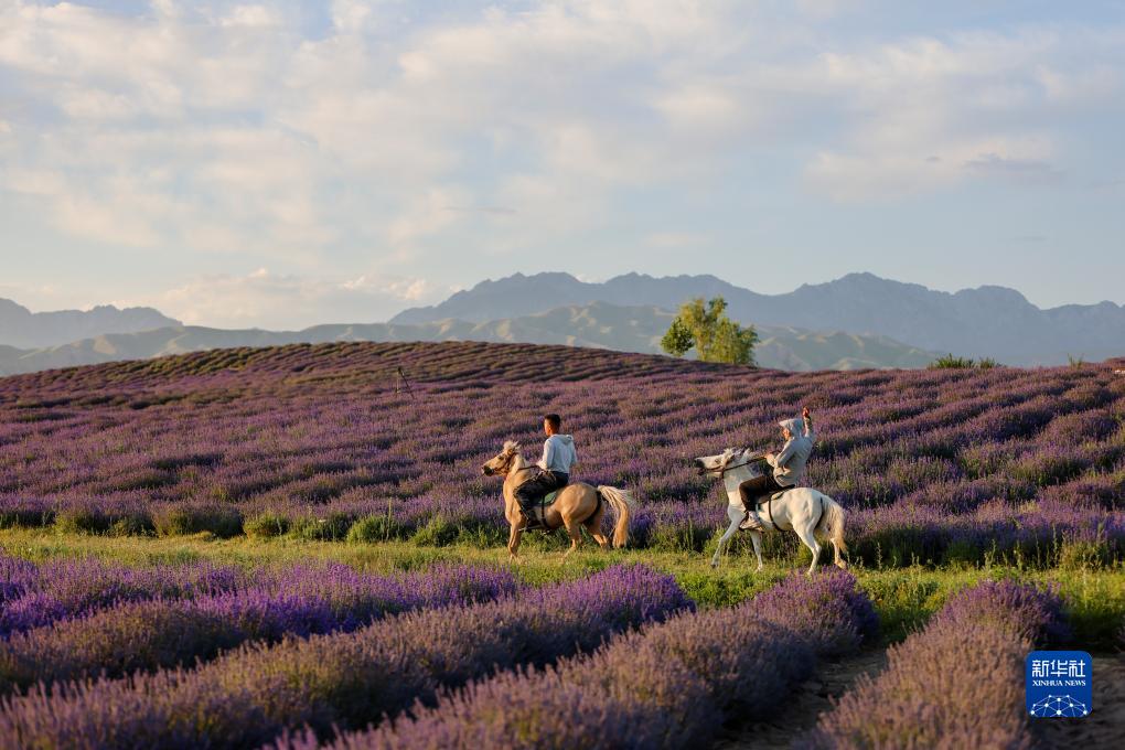 游客在新疆霍城縣蘆草溝鎮四宮村的薰衣草農場(chǎng)騎馬游玩(7月14日攝)。
