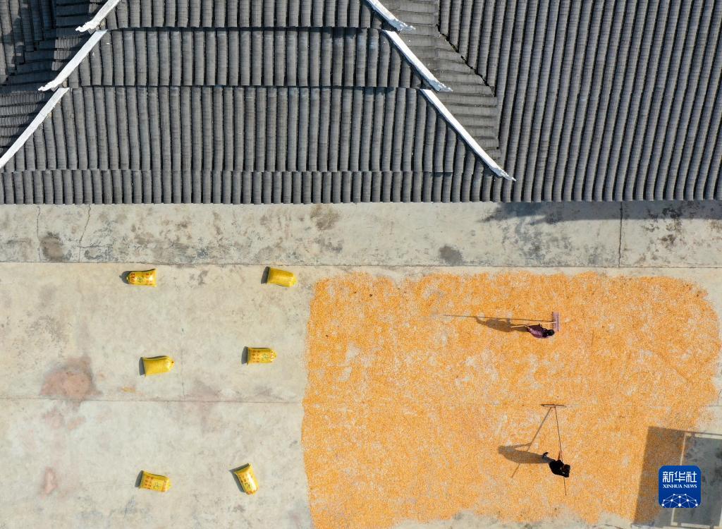 8月29日,貴州省銅仁市玉屏侗族自治縣亞魚(yú)鄉郭家灣村農民在翻曬收獲的玉米(無(wú)人機照片)。