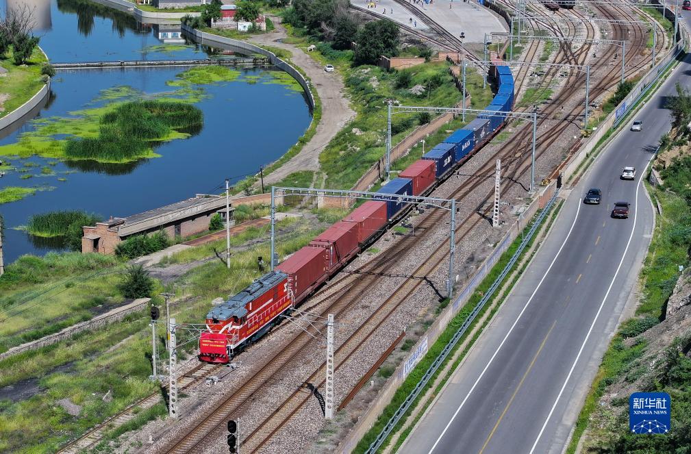 8月29日,首趟中歐(中亞)班列“京張號”從張家口市下花園鐵路貨運中心場(chǎng)區啟程(無(wú)人機照片)。