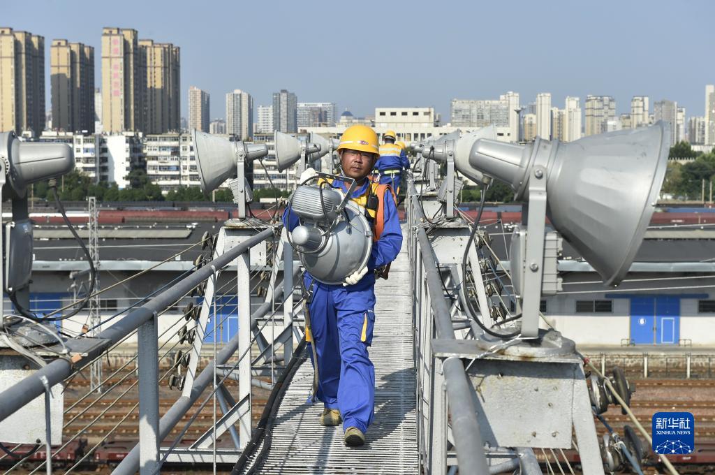 8月29日,中國鐵路鄭州局集團有限公司鄭州供電段工作人員在鄭州北站編組場(chǎng)的燈橋上檢修投光燈。