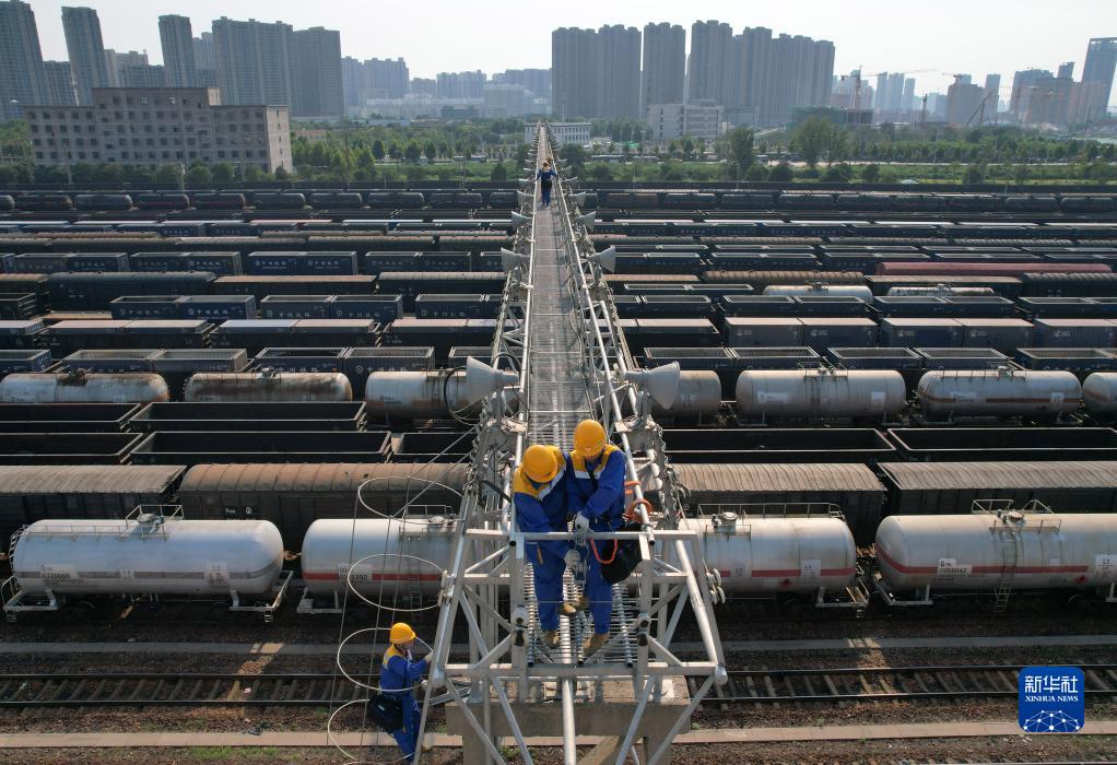 8月29日,中國鐵路鄭州局集團有限公司鄭州供電段工作人員在鄭州北站編組場(chǎng)的燈橋上檢修投光燈(無(wú)人機照片)。