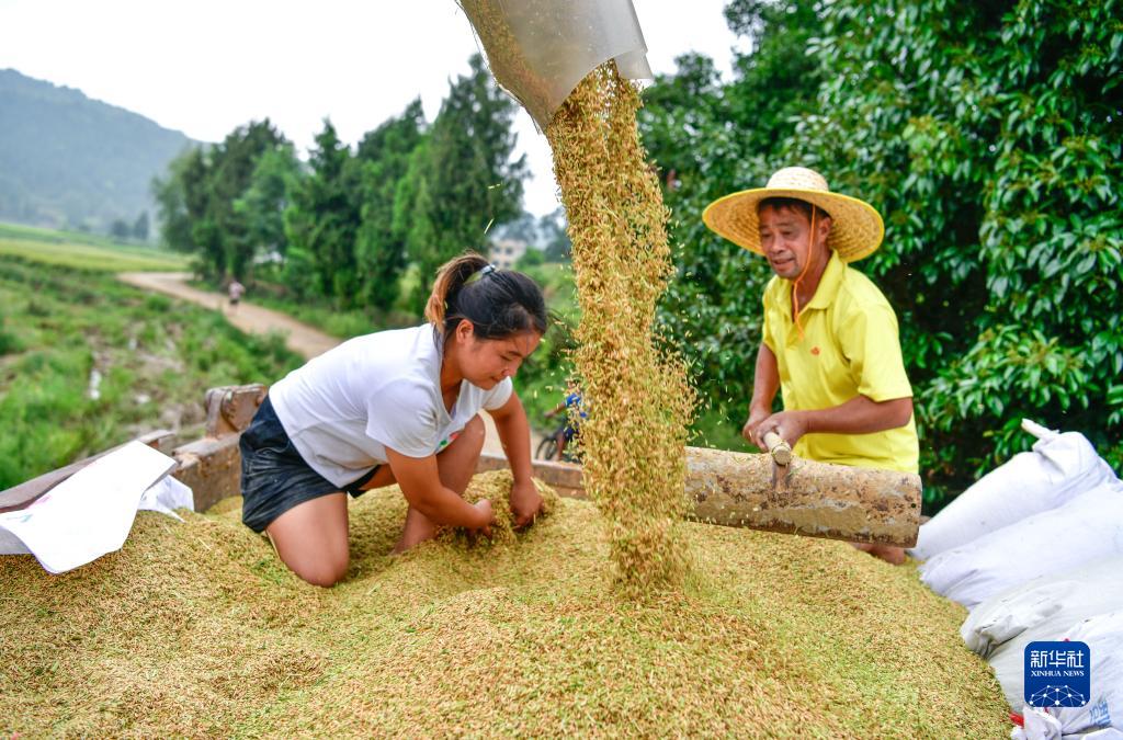 陳良東和兒媳將收割的稻種裝車(chē)(8月26日攝)。