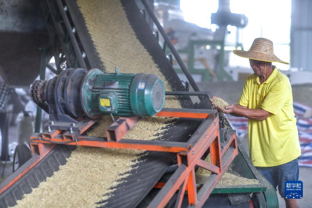 陳良東在種子加工車(chē)間查看今年收獲的稻種烘干情況(8月26日攝)。