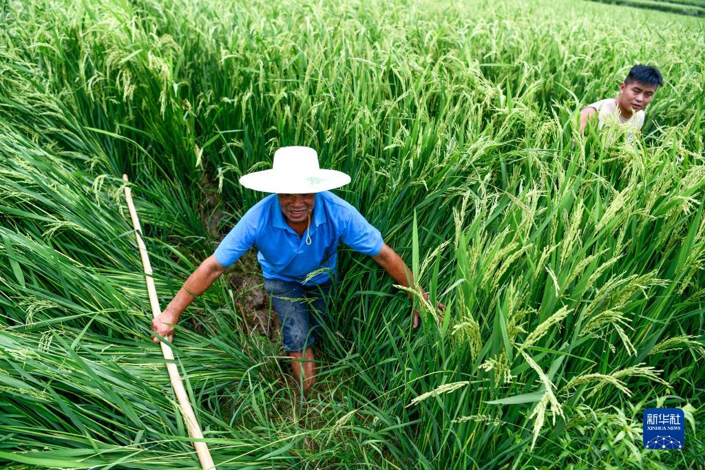 陳良東在雜交水稻制種基地利用竹竿進(jìn)行人工“趕花”授粉(8月1日攝)。