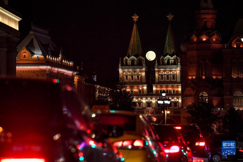 這是8月30日在俄羅斯首都莫斯科紅場(chǎng)附近拍攝的“超級月亮”。