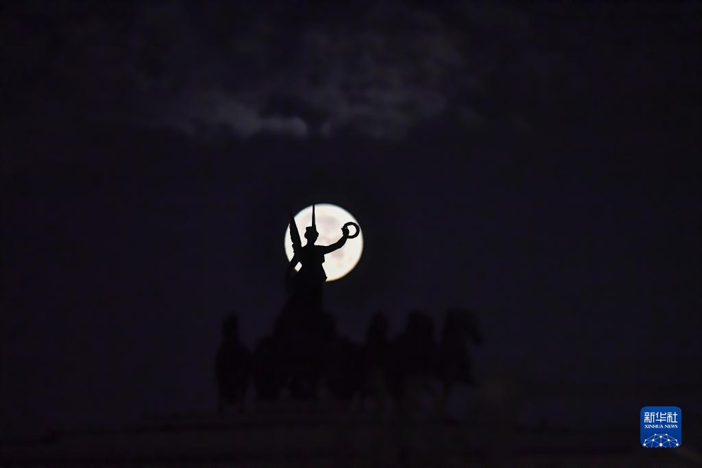 這是8月31日在俄羅斯首都莫斯科凱旋門(mén)旁拍攝的“超級月亮”。