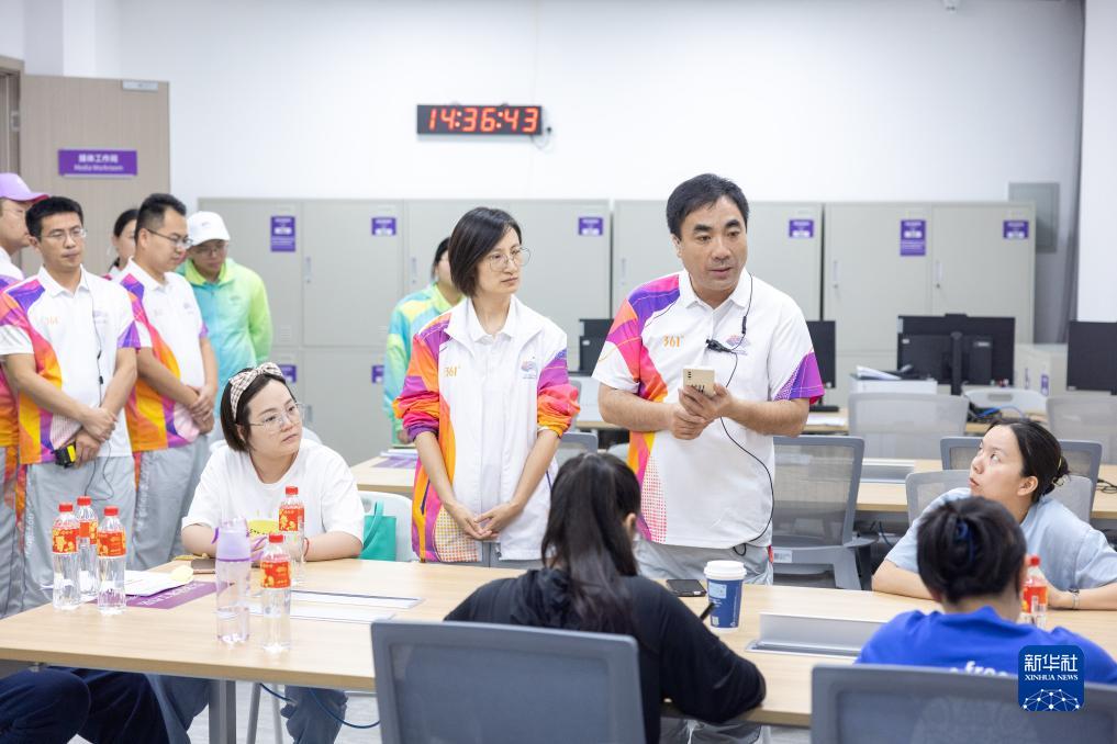 8月30日,工作人員在浙江省湖州市德清體育中心體育館根據預案進(jìn)行媒體服務(wù)演練。