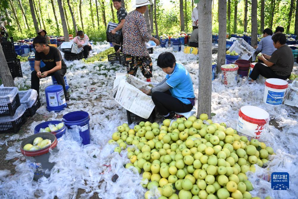 8月29日,河北唐山遷安市新房子村農民在包裝剛剛采收的鮮梨。