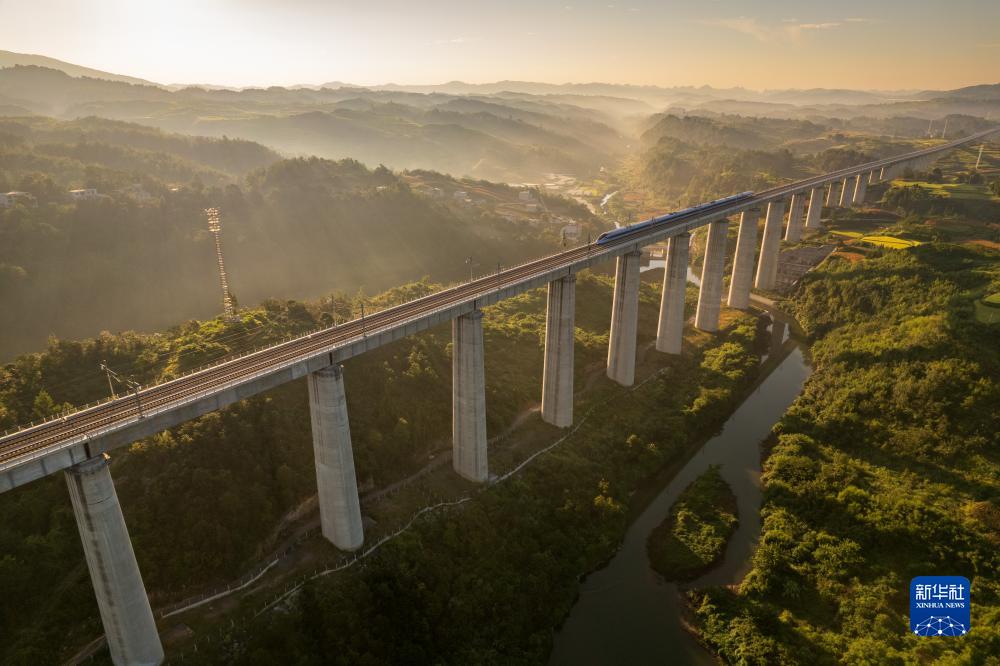8月31日,一列動(dòng)車(chē)組在晨曦中經(jīng)過(guò)位于貴州省獨山縣郊外的貴南高鐵銀坡河特大橋(無(wú)人機照片)。