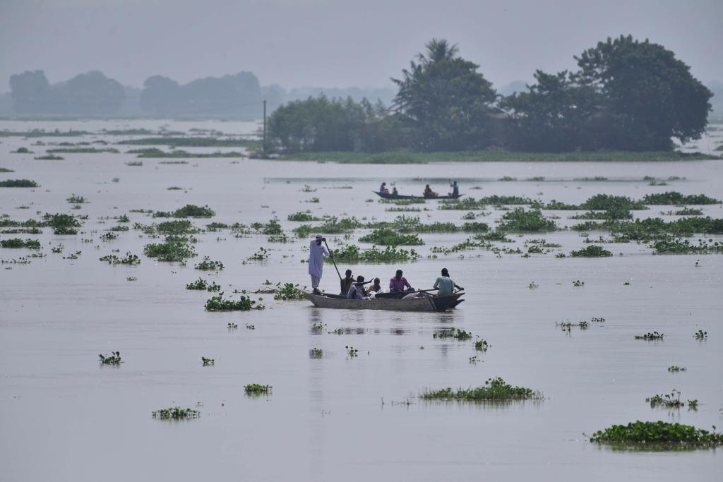 8月30日,人們在印度東北部阿薩姆邦一處洪災區域乘船出行。