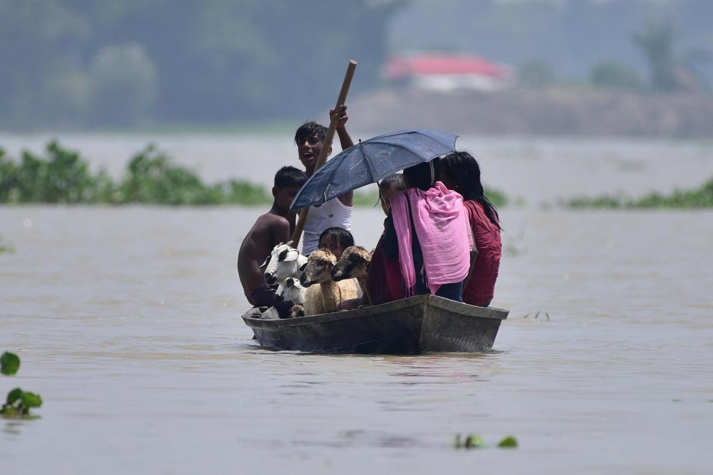 8月30日,人們在印度東北部阿薩姆邦一處洪災區域乘船出行。