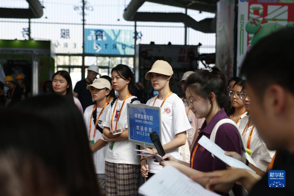 8月31日,在服貿會(huì )首鋼園區體育服務(wù)專(zhuān)題展區內,來(lái)自北京體育大學(xué)的服貿會(huì )志愿者在參加培訓。