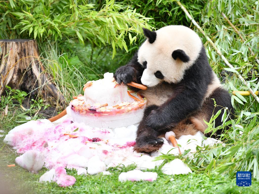 8月31日,大熊貓“夢(mèng)想”在德國柏林動(dòng)物園享用“生日餐”。