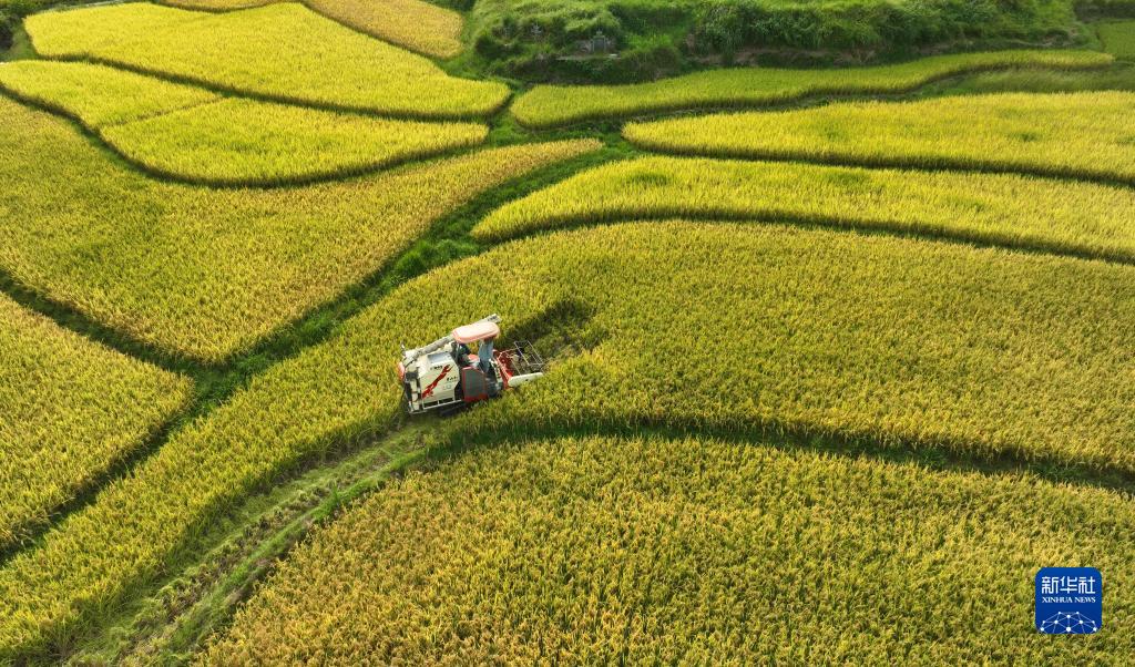8月31日,在湖南省懷化市通道侗族自治縣雙江鎮馬龍村,村民在田間收割稻谷(無(wú)人機照片) 。