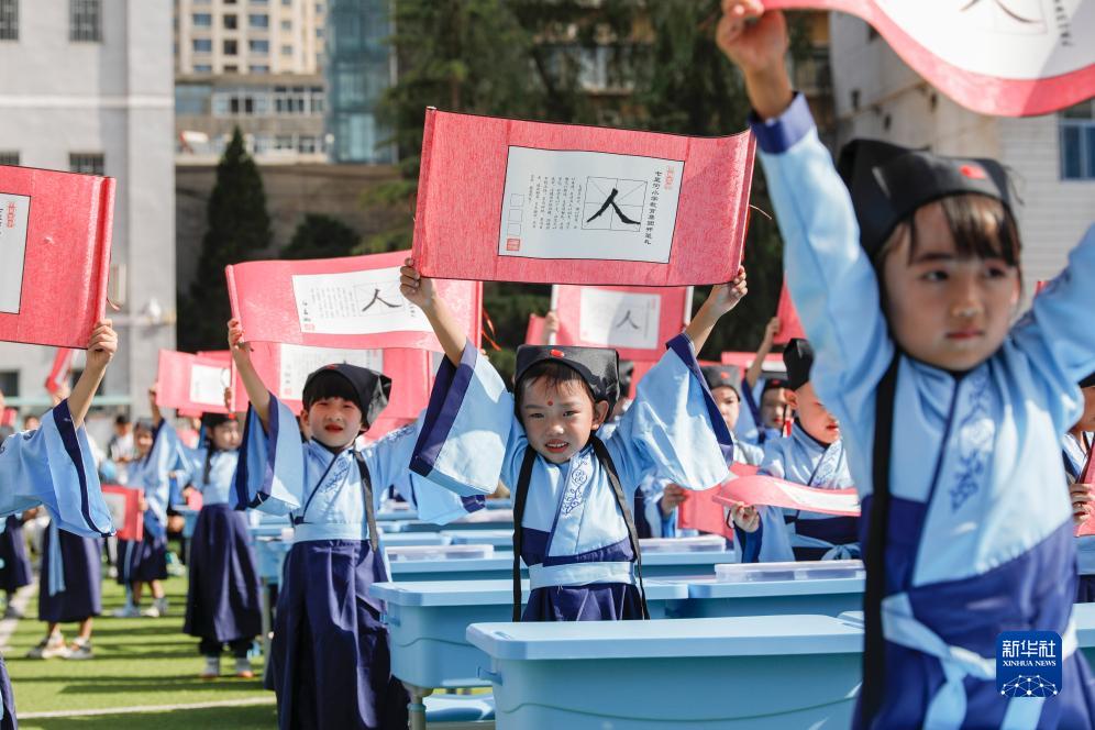 9月1日,在甘肅省蘭州市七里河區第二小學(xué),一年級新生展示書(shū)寫(xiě)的“人”字。
