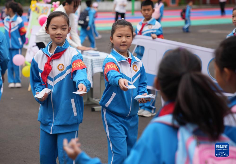 9月1日,哈爾濱市風(fēng)華小學(xué)學(xué)生在為到校同學(xué)發(fā)放新學(xué)期“登機牌”。