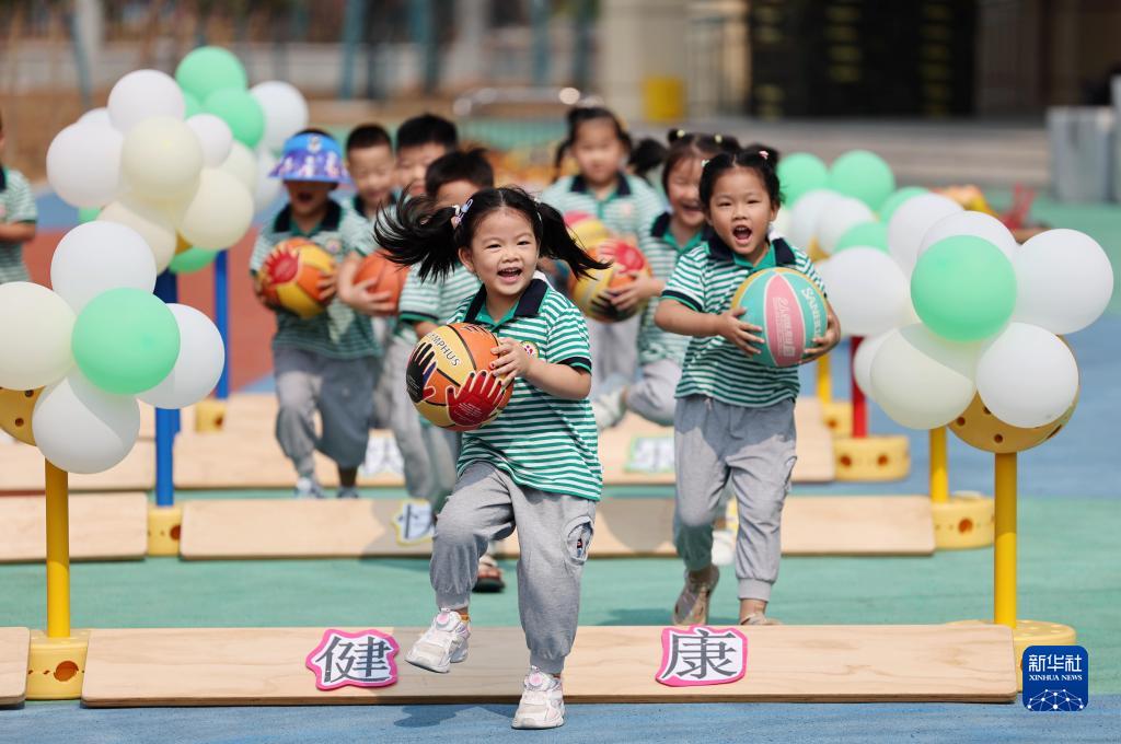 9月1日,在山東省臨沂市沂南縣第二實(shí)驗幼兒園,孩子們參加“趣味跨欄”游戲。
