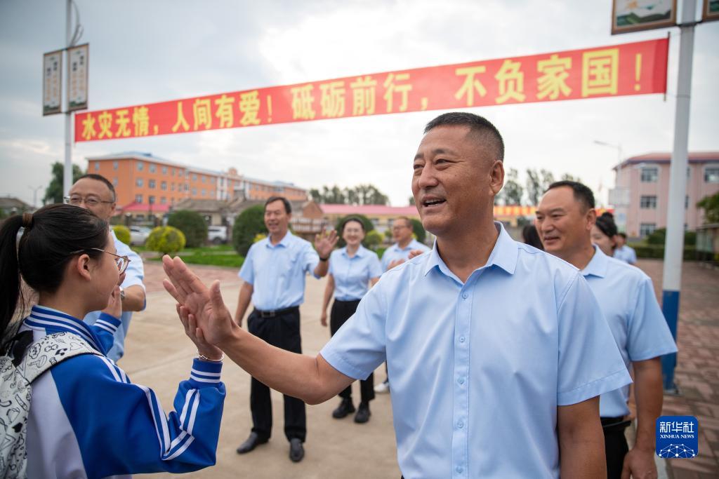 9月1日,在哈爾濱市延壽縣第四中學(xué),教師與學(xué)生擊掌。