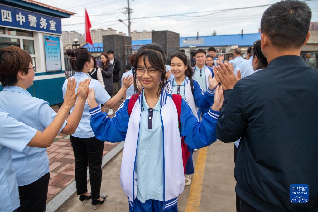 9月1日,在哈爾濱市延壽縣第四中學(xué),學(xué)生與教師擊掌。
