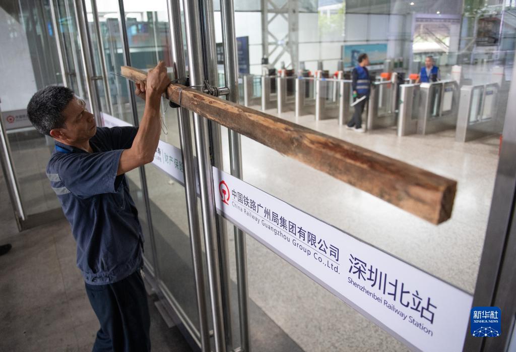 9月1日,在深圳北站出站口前,工作人員加固玻璃門(mén)。1日11時(shí)10分起,進(jìn)出深圳地區所有車(chē)站的列車(chē)全部停運。