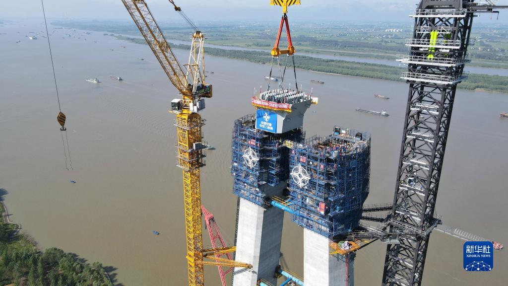 這是9月1日拍攝的中交二航局巢馬城際鐵路馬鞍山公鐵兩用長(cháng)江大橋南主塔首節段鋼塔吊裝現場(chǎng)(無(wú)人機照片)。