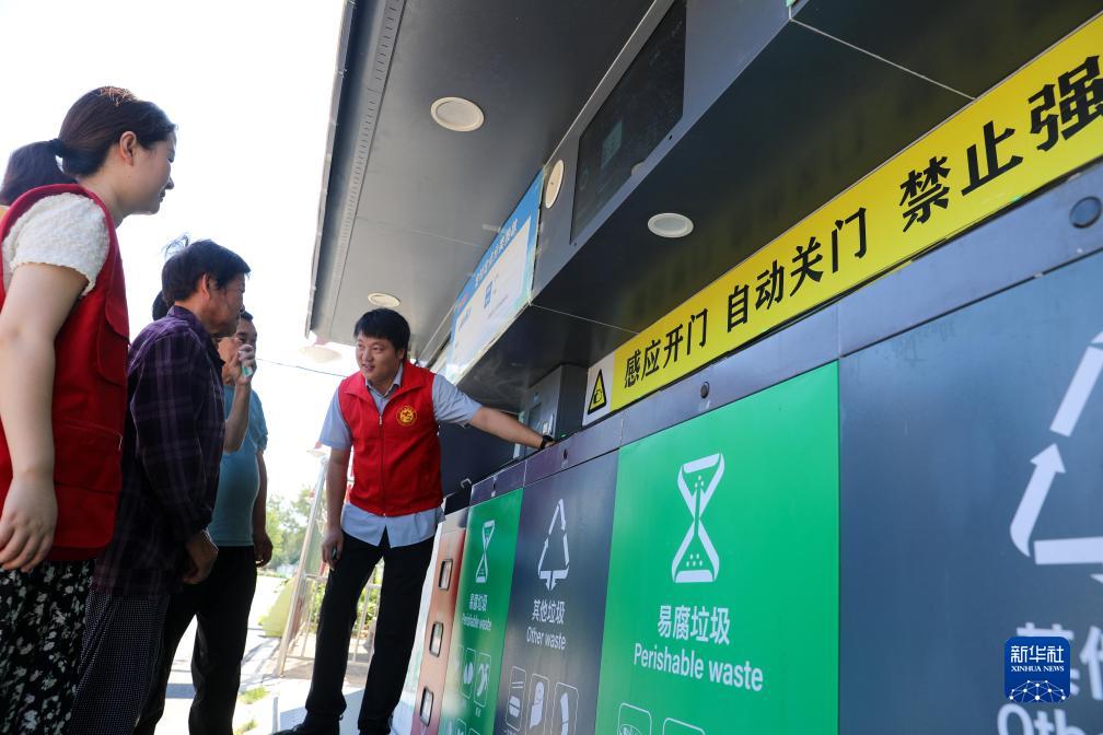 9月1日,在莊墓鎮棗林社區,志愿者指導居民使用智能垃圾分類(lèi)回收設備。