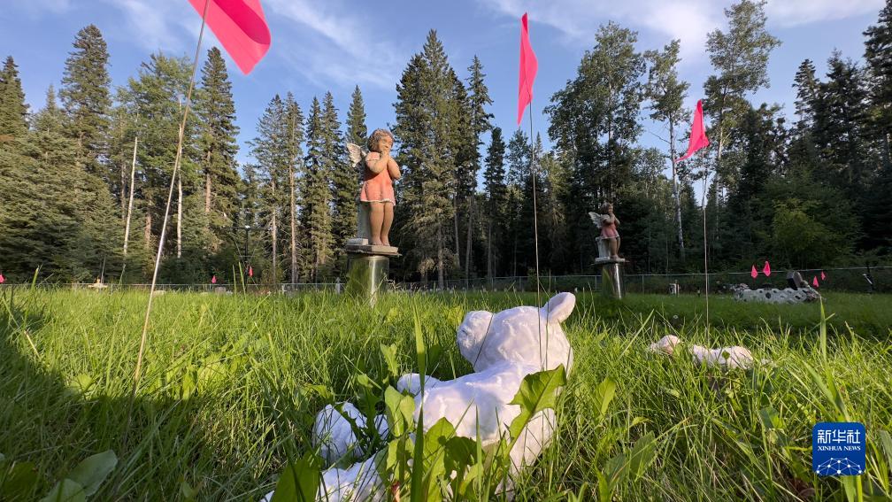 這是8月31日在加拿大薩斯喀徹溫省博瓦爾印第安人寄宿學(xué)校舊址拍攝的用粉色旗子標出的疑似兒童和嬰兒墓地。