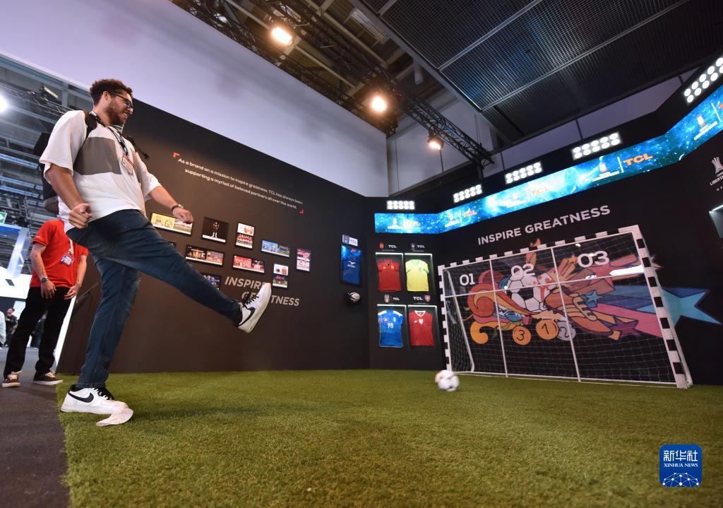 9月1日,參觀(guān)者在德國柏林國際消費電子展TCL展區體驗射門(mén)游戲。