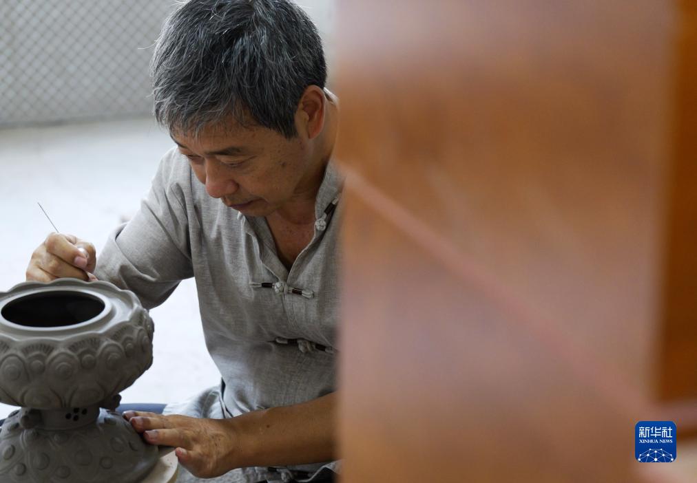8月31日,在清涼寺村的一家汝瓷生產(chǎn)企業(yè),汝瓷藝人王國奇在車(chē)間里修坯。